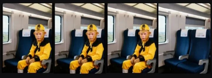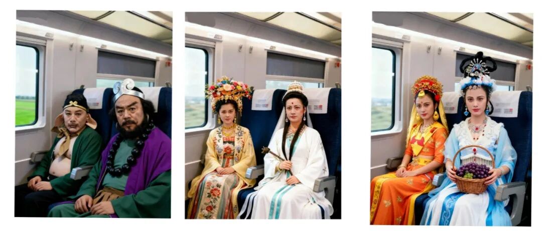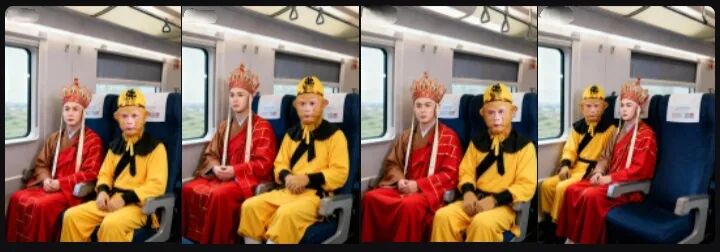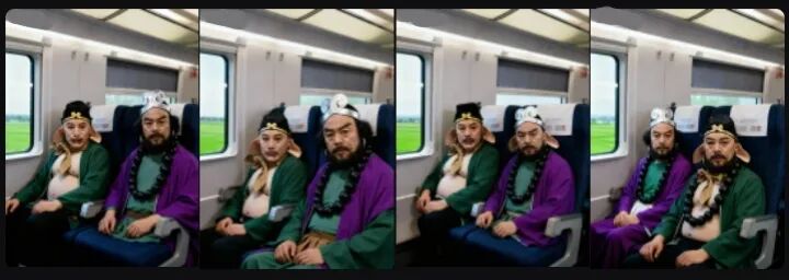 将图4保存下载,用作场景图。3.生成其余各分镜的图片接下来重复上述操作,上传其他组图片(如猪八戒与沙僧),并添加背景图即可。输入提示词:图一和图二的人物坐在图三的高铁座位上,保持人物特征,服装穿着等一致性,眼睛看着镜头。