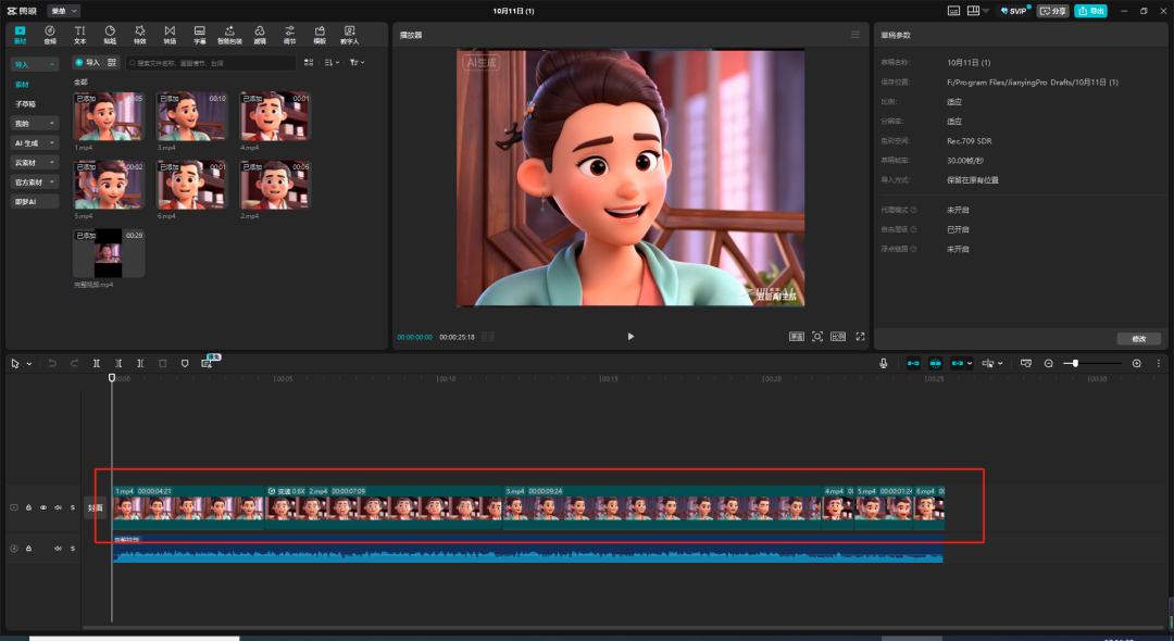 我们将获取的视频导入到剪映里面,因为我们使用数字人做的视频本身就是有音频的,所以按顺序将视频拼接一起就可以了。