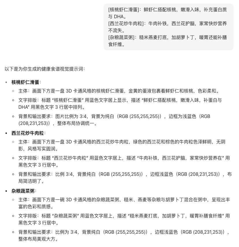 Prompt 2依据Prompt 1中的健康食谱清单,输出生成漫画图片需要的提示词。我们可以发现,提示词中含有图片尺寸、背景色、图的风格等描述,这些提示词更符合生成图片的提示词要求。