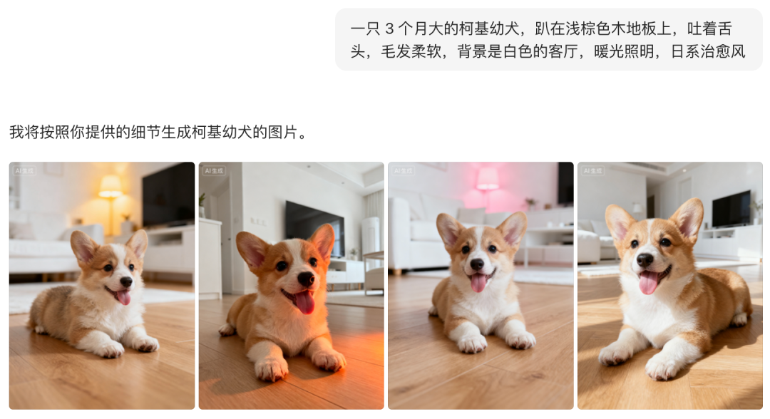 正面示例(具体):“一只 3 个月大的柯基幼犬,趴在浅棕色木地板上,吐着舌头,毛发柔软,背景是白色的客厅,暖光照明,日系治愈风”。
