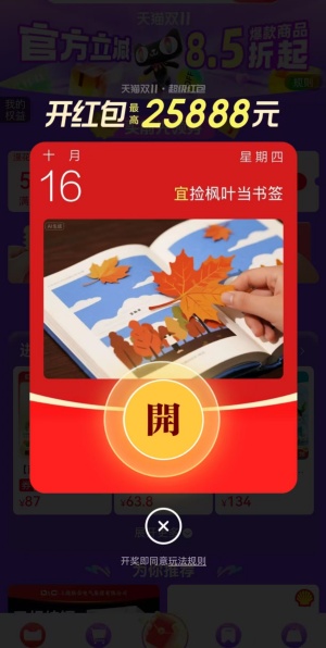淘宝双11的超级红包也开始了,跟以往超级红包的活动一样,必中的,每天都可以领,打开淘宝进去活动里,每天点击弹窗可以领到一个随机金额的淘宝无门槛红包,红包金额最高25888元,在红包首发当日、以及加码日还可以领到5元、10元以上的大包,领到的红包可以跟所有的淘宝双11红包叠加在淘宝购买实物商品无门槛抵扣使用,最低可以0撸多个实物。