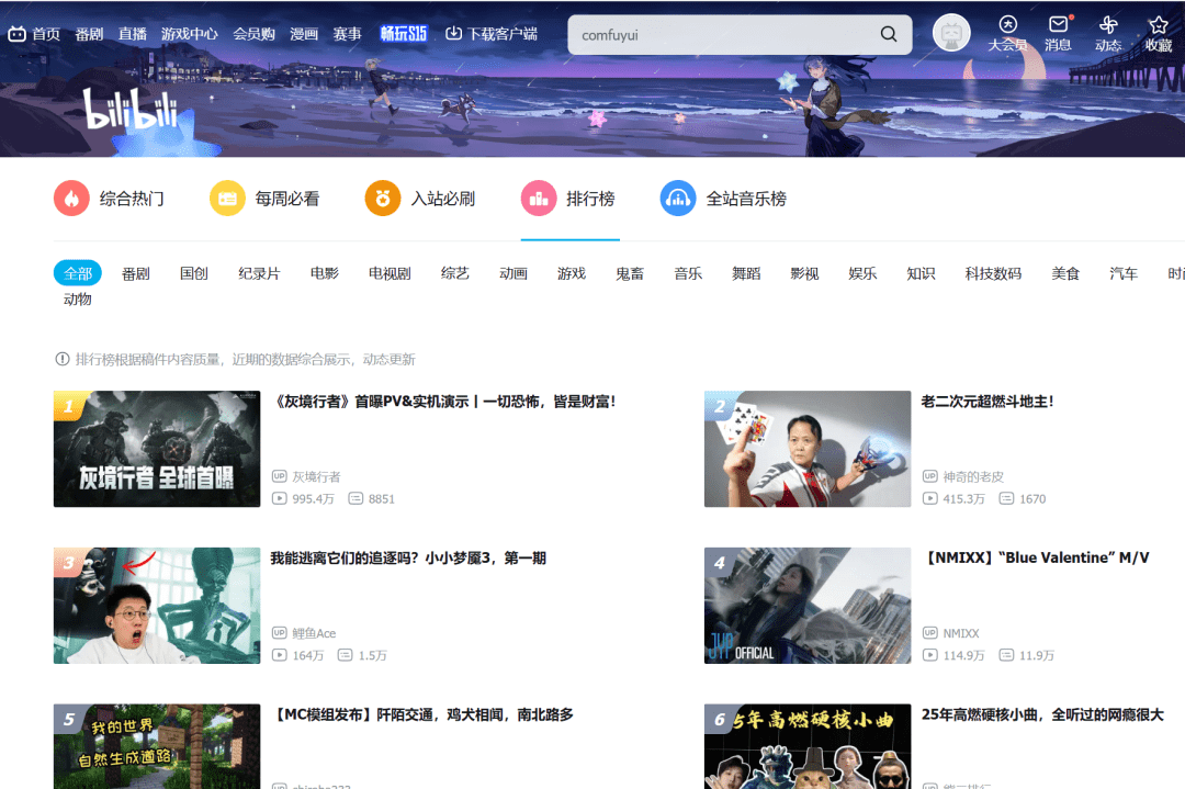 3、视频平台官方榜单(1)B 站热门https://www.bilibili.com/v/popular/rank/all分综合、动画、游戏、科技等15个分区,按播放量、弹幕量、投币数排序,可查看近1小时/3天/7天榜单。例如2025年8月《凡人修仙传》单周播放量达1.4亿,创国创区纪录。