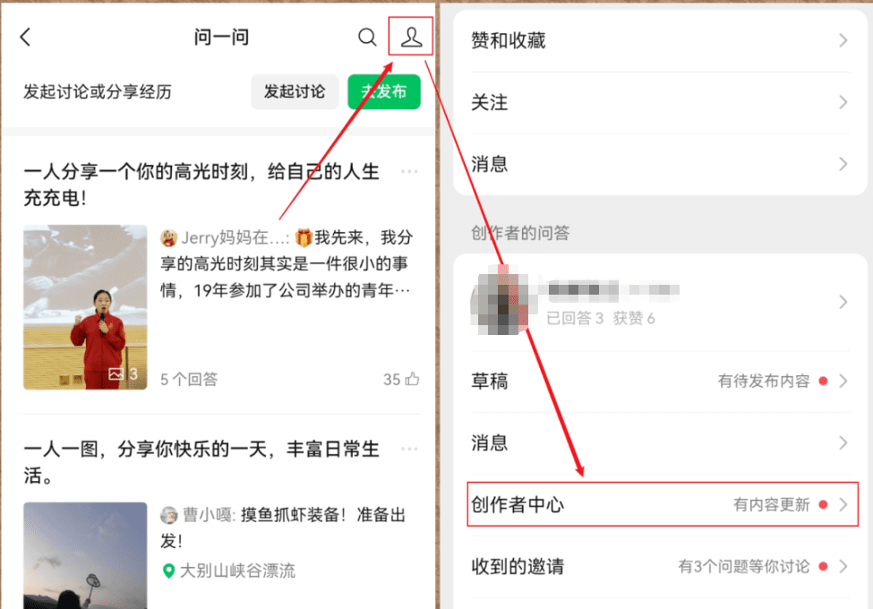 接着,点击【去问一问看更多内容】。在跳转的新界面,点击右上角的人像图标,进入【创作者中心】。
