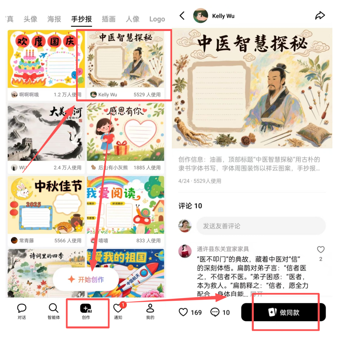 也非常简单,手机打开豆包app,点底部的AI创作,然后选择手抄报,就可以看到很多别人做好的作品了,点做同款。