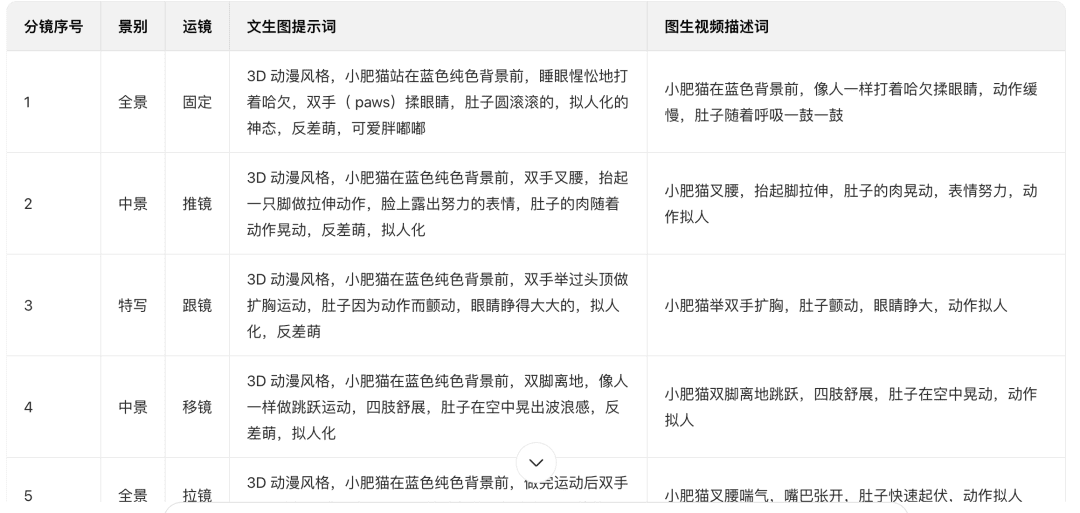 第二步:生成分镜头脚本 接下来,我们以我们选取的小肥猫作为主角,给他设计分镜头脚本,将下面的指令发给豆包: