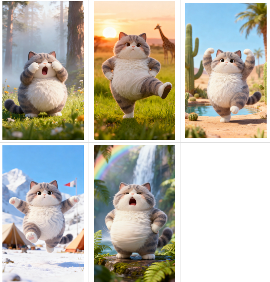 | 请根据前面的表格内的文生图提示词,帮我生成对应的图片,图片比例为9:16. 小肥猫的前后形象要统一,形象呆萌可爱,让人喜欢! |