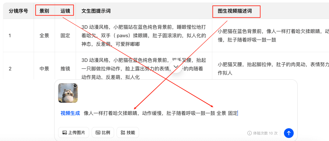 第四步:生成视频 已经有了图片,并且前面表格内有运镜,景别和图生视频描述词,下面就是将这些数据组合起来,扔给豆包,让豆包帮我们生成视频就可以了。
