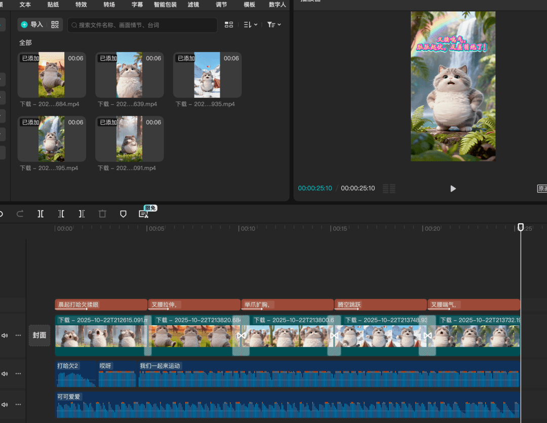 然后按照相同的方式,将剩下的4组图片生成视频,最后将这5组图片的无水印视频下载下来,大家一定要下载无水印的视频,带水印的视频,发到各道平台会被限流。不记得如何下载无水印视频的小伙伴可以看看我下面这篇文章。 100%免费!AI视频去水印方法,建议收藏!以免找不到了! 第五步:剪映剪辑成片 将上面生成的5组视频都导入到剪映内,然后按照顺序拖入主轨道内,然后给整个视频添加转场,转场的种类很多,大家可以多去尝试,选择合适的,即不要太突兀,也不要太平淡。合适就好。 添加一些音效,比如给开头添加了“打哈欠”,“哎呀声”。开头三秒最重要,大家一定要多花点心思。 再添加一个背景音乐,比如这个视频是早起做运动的,就可以找一首比较欢快的曲子做背景音乐。 忘记一件事,就是开始设计分镜头脚本的时候,忘记给每个镜头设计文案,下面让豆包给我们添加上文案,可以给豆包如下指令:
