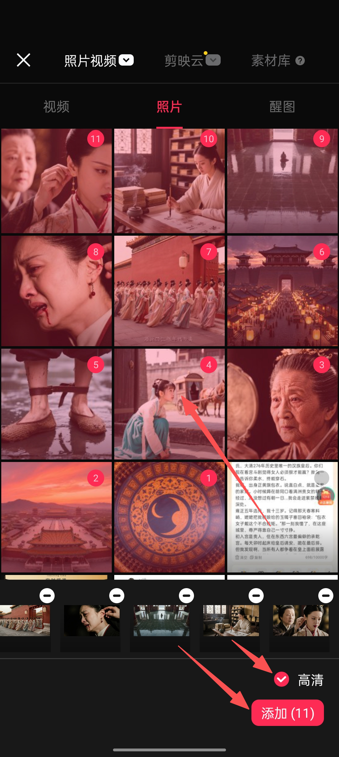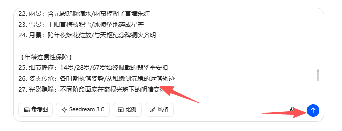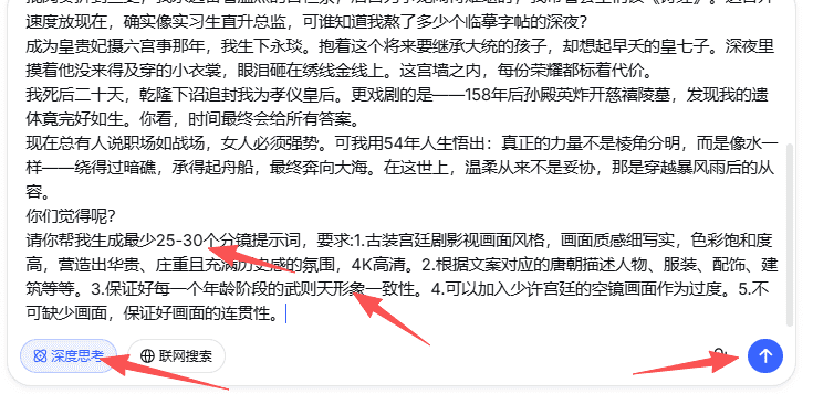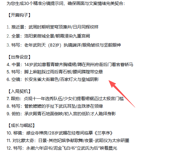 文案生成好了之后,咱们就可以生成分镜词了再次输入口令:(文案)请你帮我生成最少25-30个分镜提示词,要求:1.古装宫廷剧影视画面风格,画面质感细写实,色彩饱和度高,营造出华贵、庄重且充满历史感的氛围,4K高清。2.根据文案对应的唐朝描述人物、服装、配饰、建筑等等。3.保证好每一个年龄阶段的武则天形象一致性。4.可以加入少许宫廷的空镜画面作为过渡。5.不可缺少画面,保证好画面的连贯性。