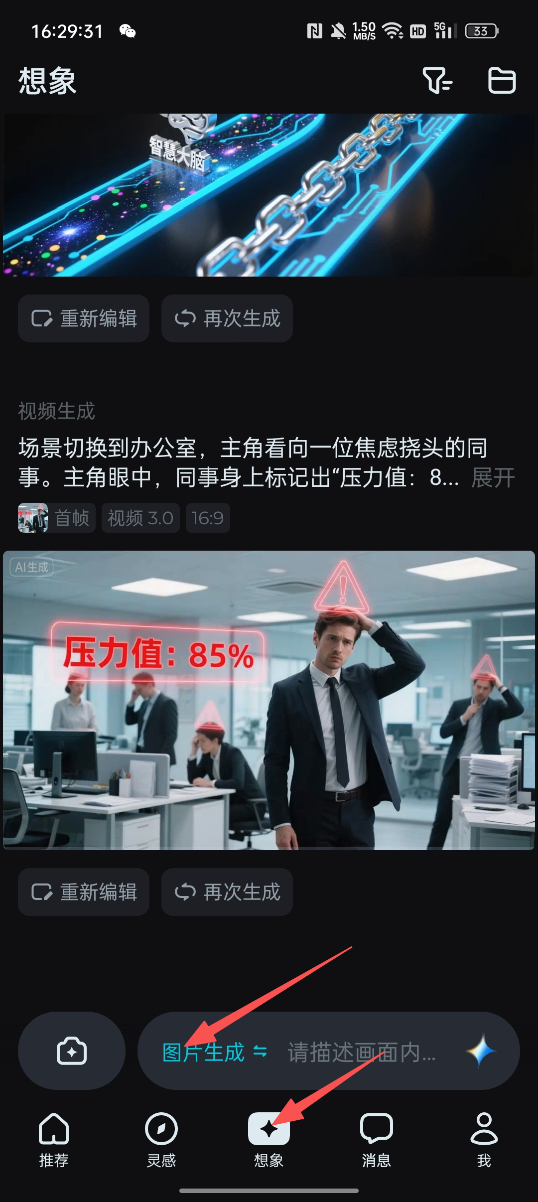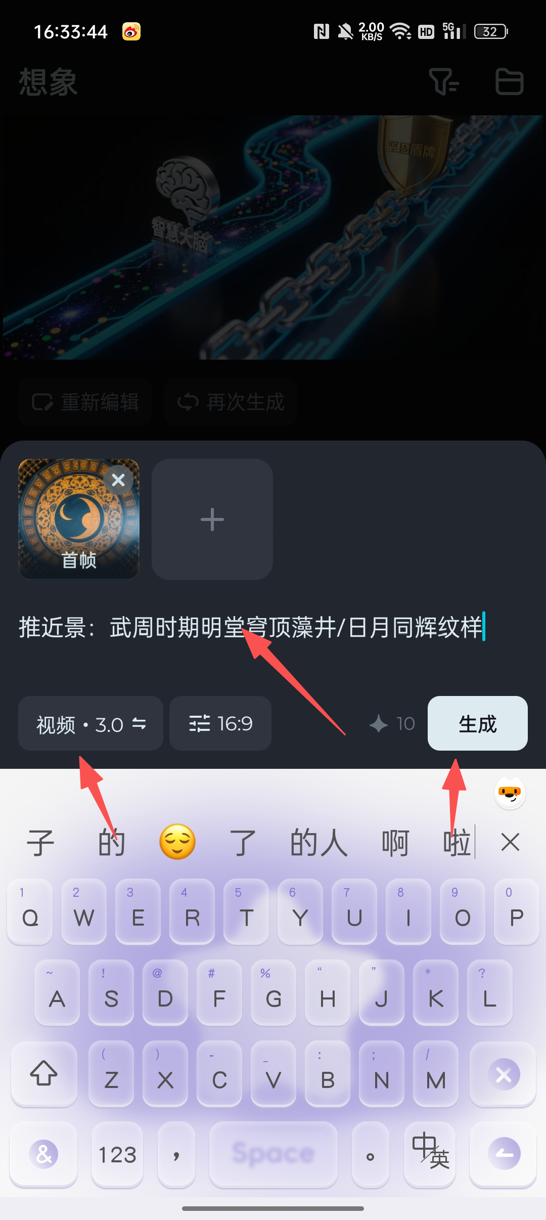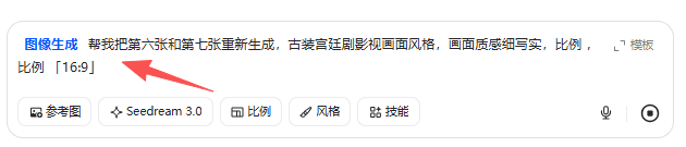 有了分镜词,下一步用豆包生成图片打开豆包,选择图像生成,选择3.0模式,比例选择16:9,然后粘贴提示词