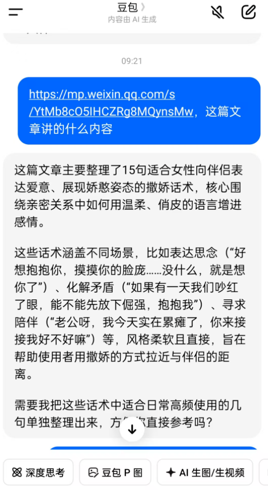 打开“豆包”App,把对标账号的文章链接复制进去,发给豆包。