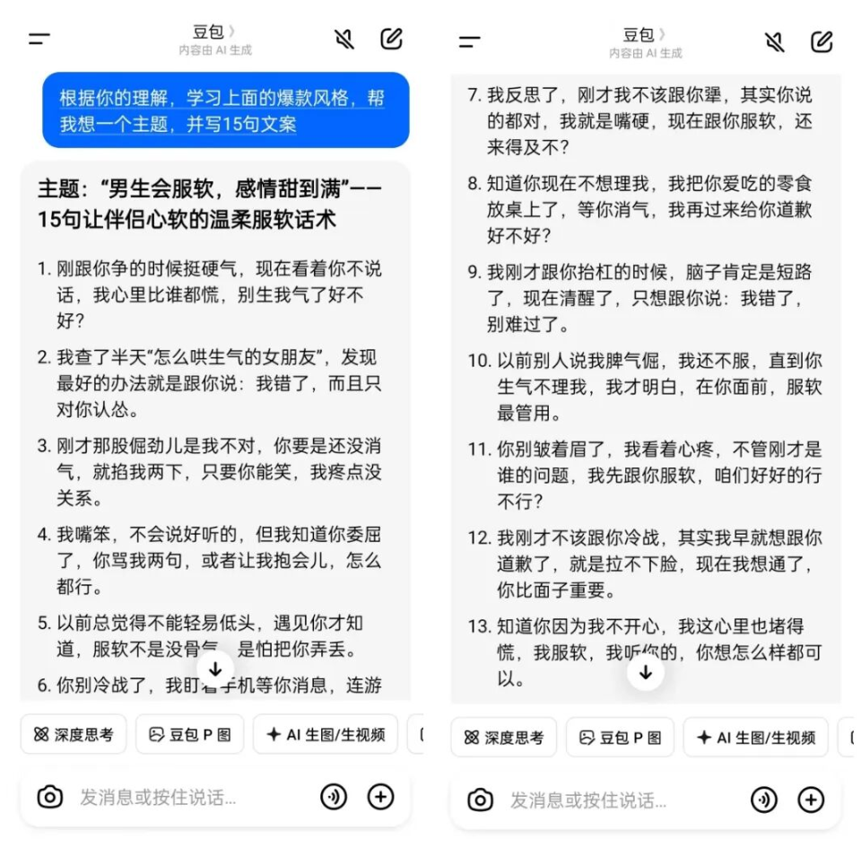 接着,让AI根据它的理解,模仿一个类似的选题,并生成15条风格相近的情感文案,就像下面这样: