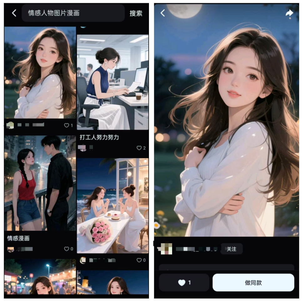 配图同样不难。打开手机上的“即梦AI”工具,在搜索栏输入“情感动漫”,马上就能看到一大堆别人已经做好的图。随便点开一个,点击“做同款”。