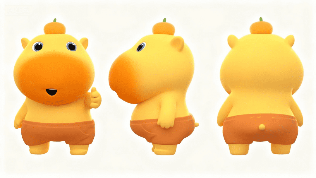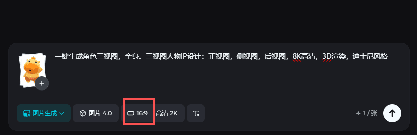 然后打开即梦AI(手机端直接去手机应用商店下载即可)设计一个三视图效果上传你下载下来的图片写上提示词:一键生成角色三视图,全身。三视图人物IP设计:正视图,侧视图,后视图,8K高清,3D渲染,迪士尼风格比例一定是16:9的