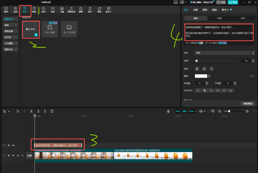 4. 视频剪辑打开剪映将生成好的视频导入进来然后添加文本,将前面的文案粘贴进来