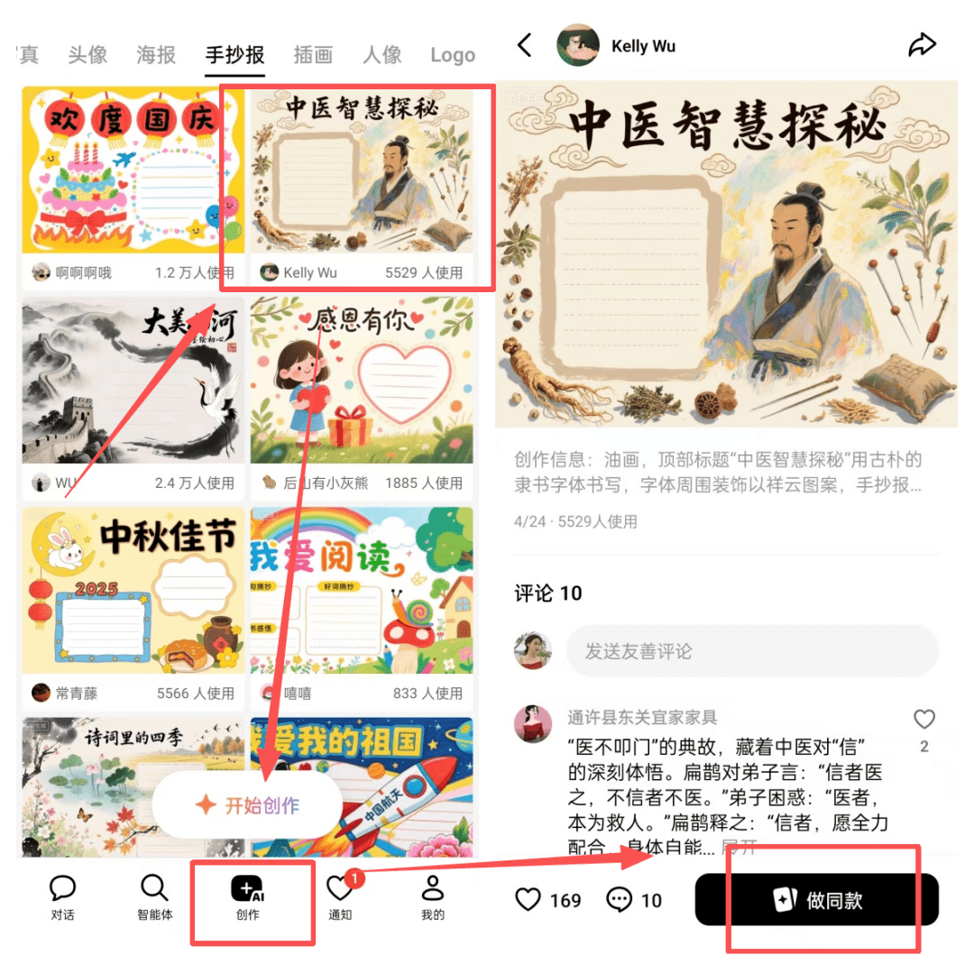 那这种线稿怎么用AI搞出来?方法巨简单!掏出手机,打开豆包app(记牢这个名字)。进去后点底部菜单的「AI创作」,接着找到「手抄报」分类,里面好多别人做好的模板,选一个你觉得合适的,直接点“做同款”