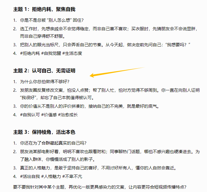 作为短视频博主,你专注于创作自我成长、价值认可、人格魅力等方向的语录内容,善于用简练的语言传递深刻的思想内核。请根据我提供的文案风格,围绕不同主题撰写新的短视频文案。具体要求如下: