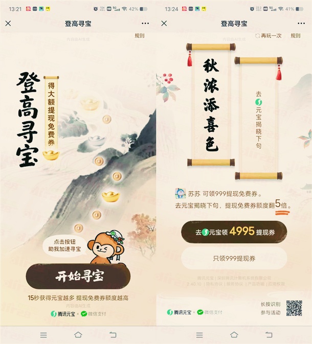 正文 微信登高寻宝小游戏领微信免费提现券 首码推荐 V管理员 /昨天 /169 阅读 1028 微信登高寻宝小游戏领免费提现券活动,打开微信进去活动里,完成简单的小游戏,可以领到最少几千微信免费提现券(需要去腾讯元宝领),如果不满意分数可以反复玩,提现券可以用于微信提现的时候免手续费。 微信扫下面码进入活动: 活动时间:结束日期未知 进入活动页面完成简单的小游戏,可以领到最少几千微信免费提现券(需要去腾讯元宝领),如果不满意分数可以反复玩,提现券可以用于微信提现的时候免手续费。 投诉/删帖