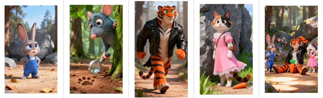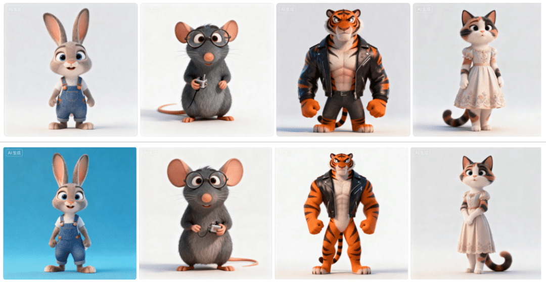 下面就带大家一起看看这类视频是如何制作的,学废的朋友们可以自己动手做起来。 第一步:制作主角IP形象 如果要深耕一个赛道,一定要有统一的IP形象,火起来之后,这个IP形象就是一个招牌,对于后期的变现,或者开发周边,都是非常有利的。 我们也学习原博主的人物设计,分别设计四个主角:兔子、老鼠、老虎、花猫。这只是一个参考,大家可以自己设计自己的专属IP形象。在豆包内输入如下指令: