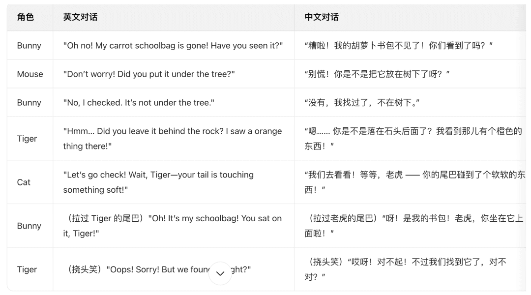 | 你是一名儿童英语专业教学的短视频博主,非常擅长3-12岁宝贝的英语教学,喜欢以动画片的形式进行英语教学,将枯燥无味的英语学习转化为孩子喜欢看的动画片。请帮我设计三组故事片。要求:1、故事有剧情,有知识点,幽默有趣;2、故事主角为兔子、老鼠、老虎、花猫。3、以对话的形式输出。对话内容为中英文对照。 |