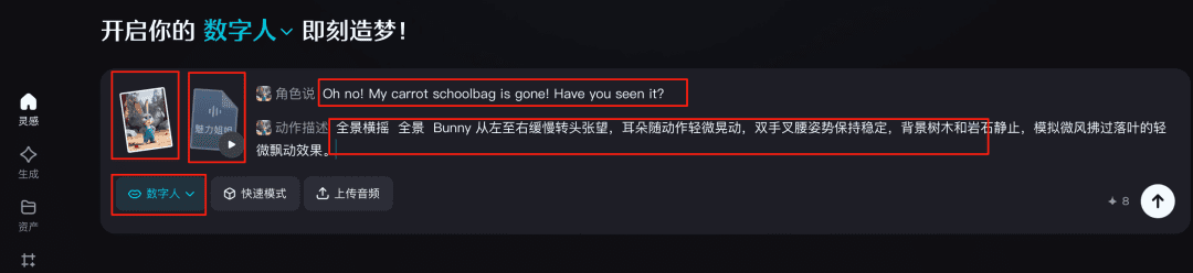 大家可以再回去看看开始设计的文案,看看最终生成的图片是否符合文案设计,如果不符合,可以让豆包重新给我们生成,这一步很关键,因为最终展现在观众面前的就是这些画面。 第四步:生成视频 因为这次的视频是需要对话的,所以我们到即梦中去做视频生成,因为即梦有对口型的视频生成方式。打开即梦,选择数字人,然后按照下图操作: