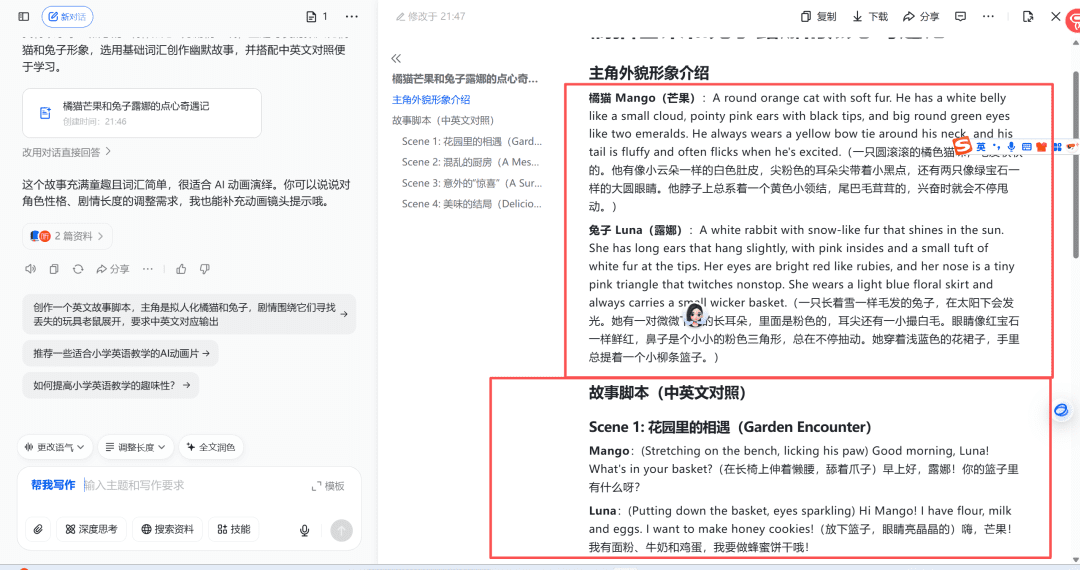 实战教程1.文案生成文案生成常用kimi、deepseek、claude、chatgpt或者豆包等等工具进行生成,这边我主要是为了方便我做案例,因此才选择豆包。输入提示词:你是一名做小学英语教学的自媒体创作者,你擅长通过AI动画片的形式,将枯燥无味的英语学习通过影视方式来演绎,让整个学习变得非常有趣。请严格按照以下要求,帮我创作一个英文故事。