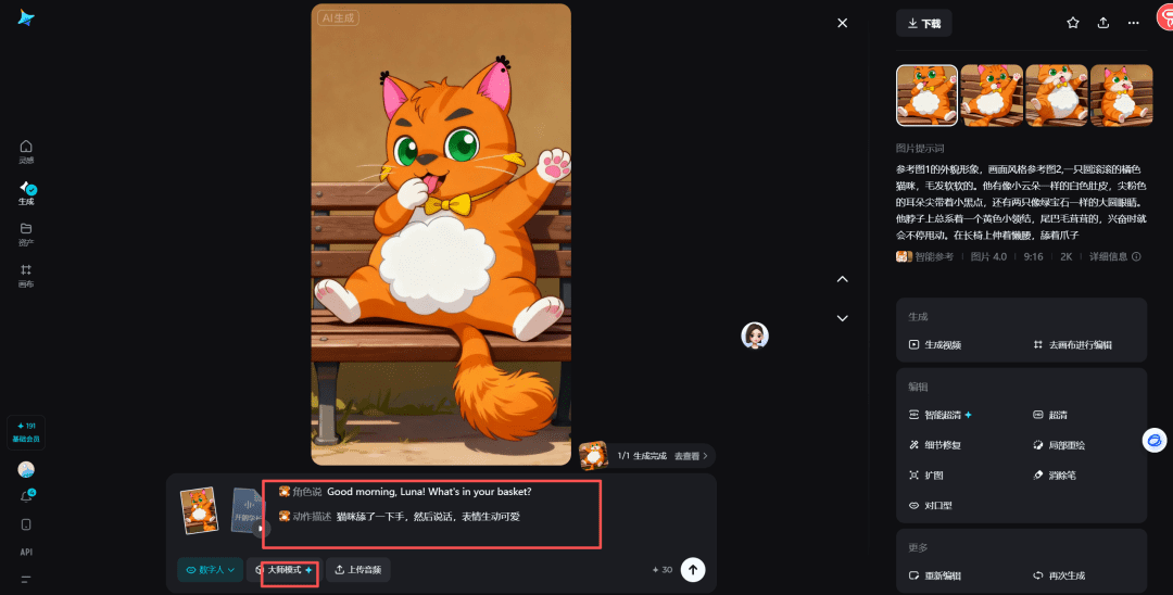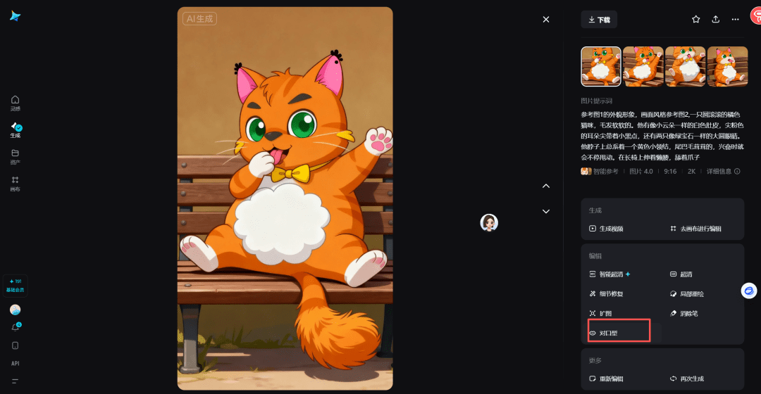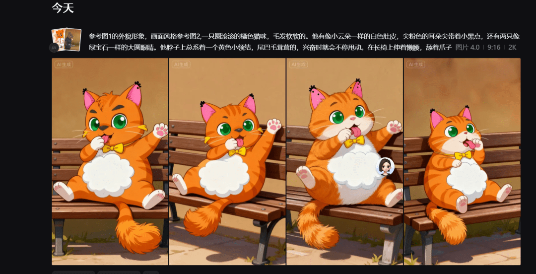 网址:https://jimeng.jianying.com/ai-tool/generate/?type=image图片模型选择图片4.0上传我们下载好的ip形象图片和对标图片作为参考图,输入豆包给我们生成ip形象提示词和画面提示词进行生图,提示词:参考图1的外貌形象,画面风格参考图2,一只圆滚滚的拟人化橘色猫咪,毛发软软的。他有像小云朵一样的白色肚皮,尖粉色的耳朵尖带着小黑点,还有两只像绿宝石一样的大圆眼睛。他脖子上总系着一个黄色小领结,尾巴毛茸茸的,兴奋时就会不停甩动。在长椅上伸着懒腰,舔着爪子
