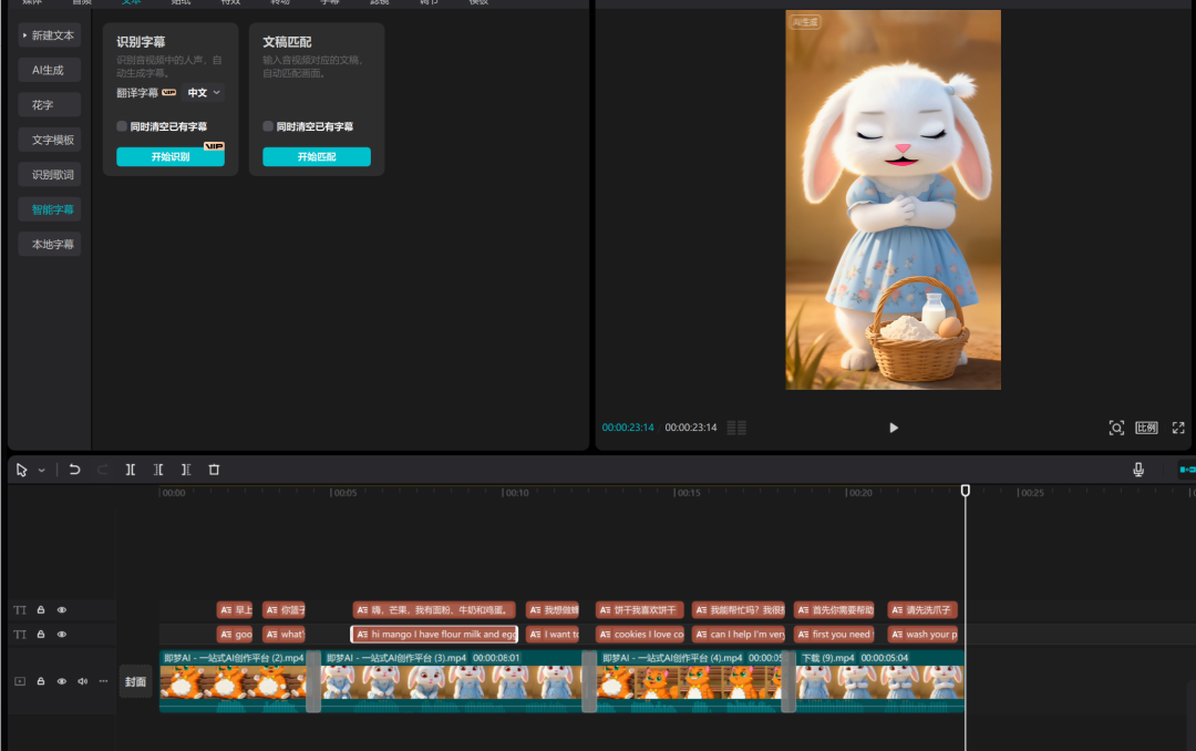 点击文本,选择智能字幕,选择翻译字幕为中文,点击开始识别,就会生成中英文字幕