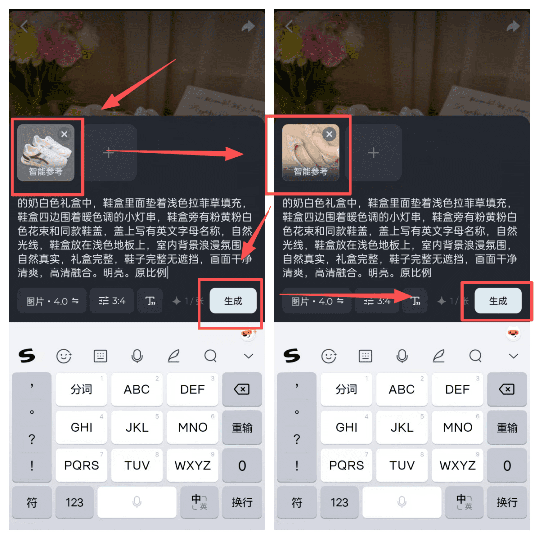 我们的目的是把即梦图片里的运动鞋换成上面这双平底鞋,操作也非常简单,点开即梦里鞋子图片,把参考图片换成这张图即可。