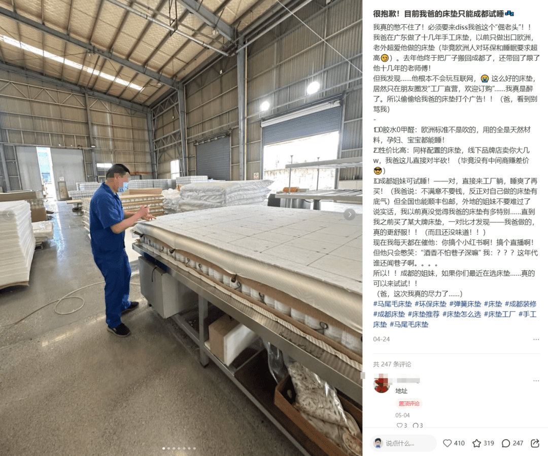 也在工厂怎么在小红书引流说过一个床垫工厂的例子,这个例子还比较巧,刚好是我一个365陪跑学员的朋友的账号,居然被我拆解到了。