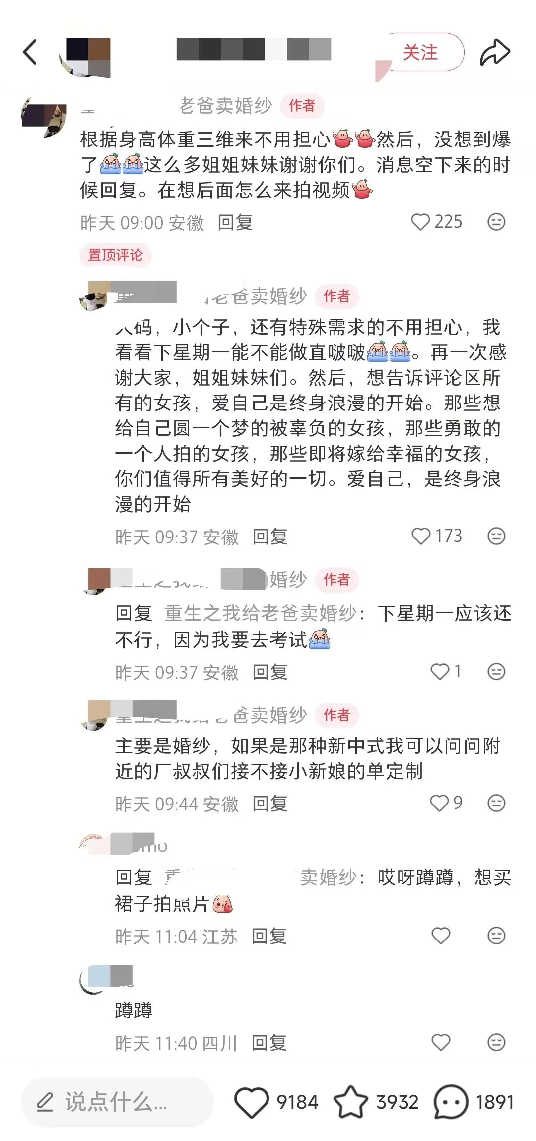 然后这个博主评论区置顶一下话术,给一下买婚纱的情绪价值,并且有些句子就显得很像真的一样,最后还来一句自己要去考试回的慢,体现她作为子女的身份。