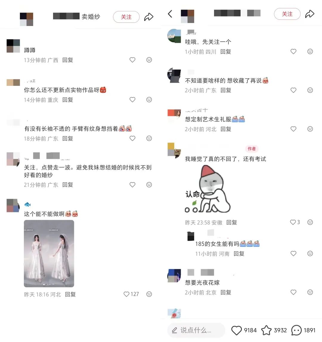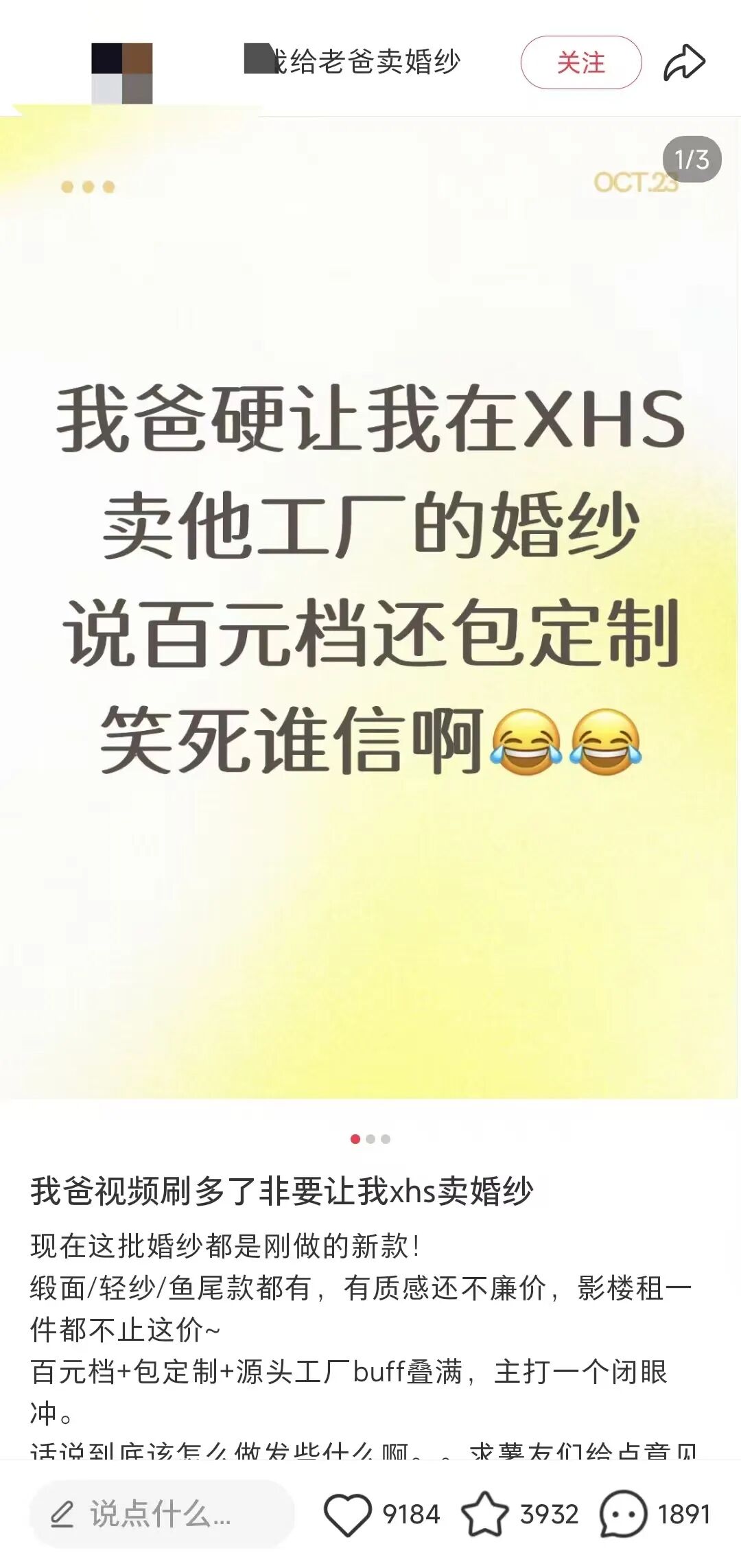上面婚纱的笔记标题和开头直截了当:“我爸硬让我卖他工厂的婚纱,说百元档还包定制,笑死谁信啊”。