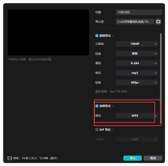 1.把生成音乐导入剪映,先分割成20-30s以内的,选择时间区间,可以一段一段导出,选择MP3格式,做好段落编号记录