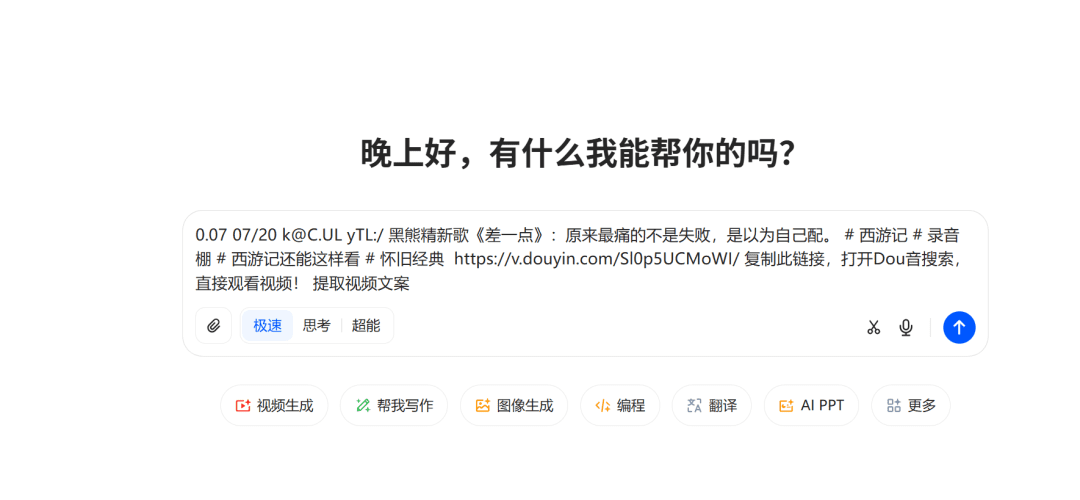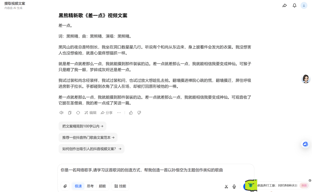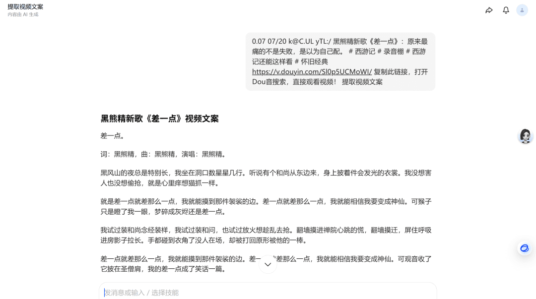 实战教程1.文案生成文案生成常用kimi、deepseek、claude、chatgpt或者豆包等等工具进行生成,这边我主要是为了方便我做案例,因此才选择豆包。为了保证不侵权,这边还是建议用AI来生成原创歌曲,虽然很多人都是直接找网上的歌曲来直接制作,但是我们还是少给自已增加麻烦,最重要现在有AI助力,创作对于我们来说不是一个难事。提取对标视频的链接发送给豆包