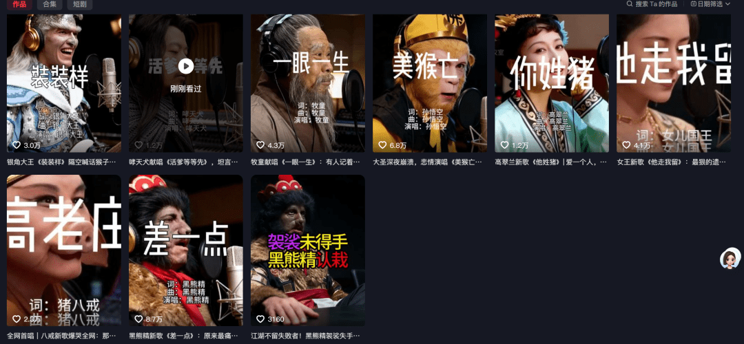 今日给大家拆解一个借助经典的影视人物进行二创的账号,这类账号和以前的类型不一样,主要借助影视人物演绎录音棚录歌的场景,卷起了妖怪鬼怪正式出道发布歌曲的视频,每个人物都是我们熟悉的样子,但是不熟悉的状态,非常有意思。