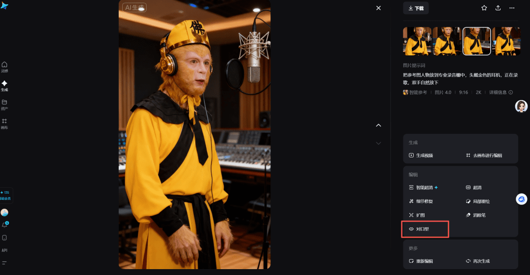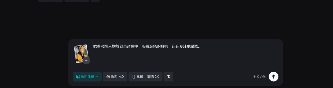 网址:https://jimeng.jianying.com/ai-tool/generate/?type=image图片模型选择图片4.0上传我们下载好的ip形象图片作为参考图,输入提示词:参把参考图人物放到专业录音棚中,头戴金色的耳机,正在录歌