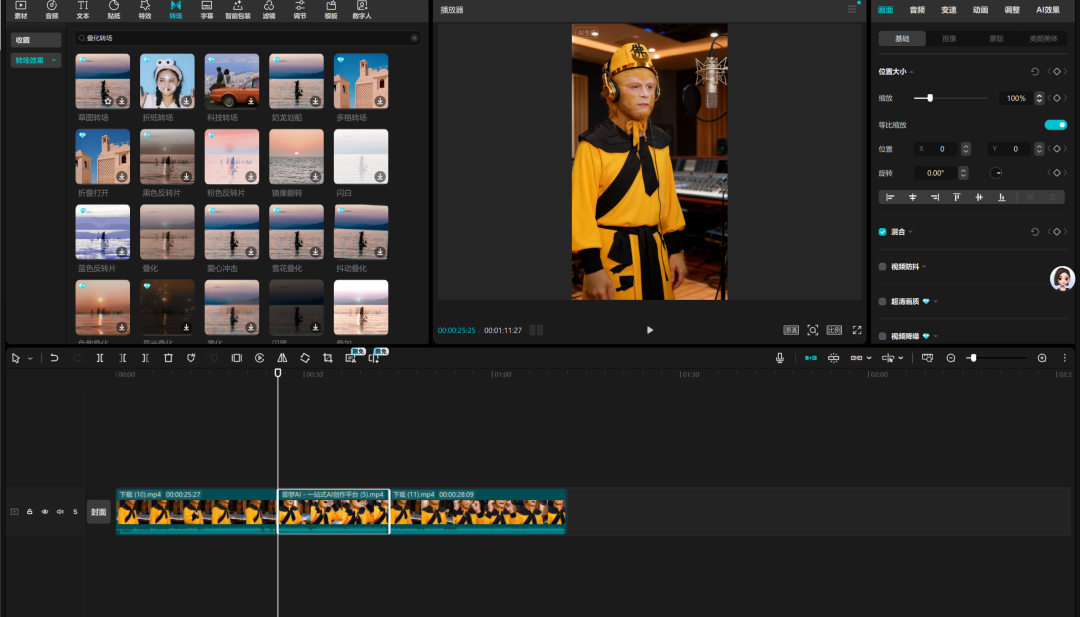 4.剪辑成片打开剪映桌面版本,导入所有视频片段,添加合适的转场