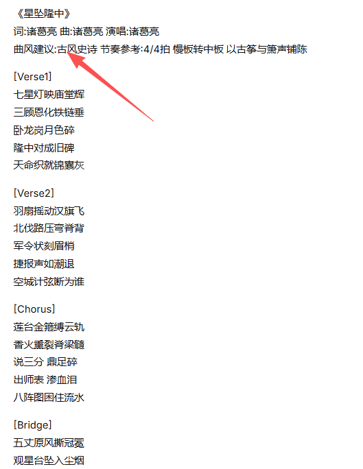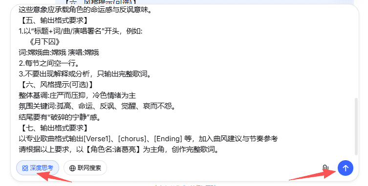 第一步:用deep seek制作歌词第一步,打开deep seek,打开深度思考,粘贴口令词口令词:你是一名古风影视歌词创作者,请你以“影视人物独白歌曲”的风格创作歌词。