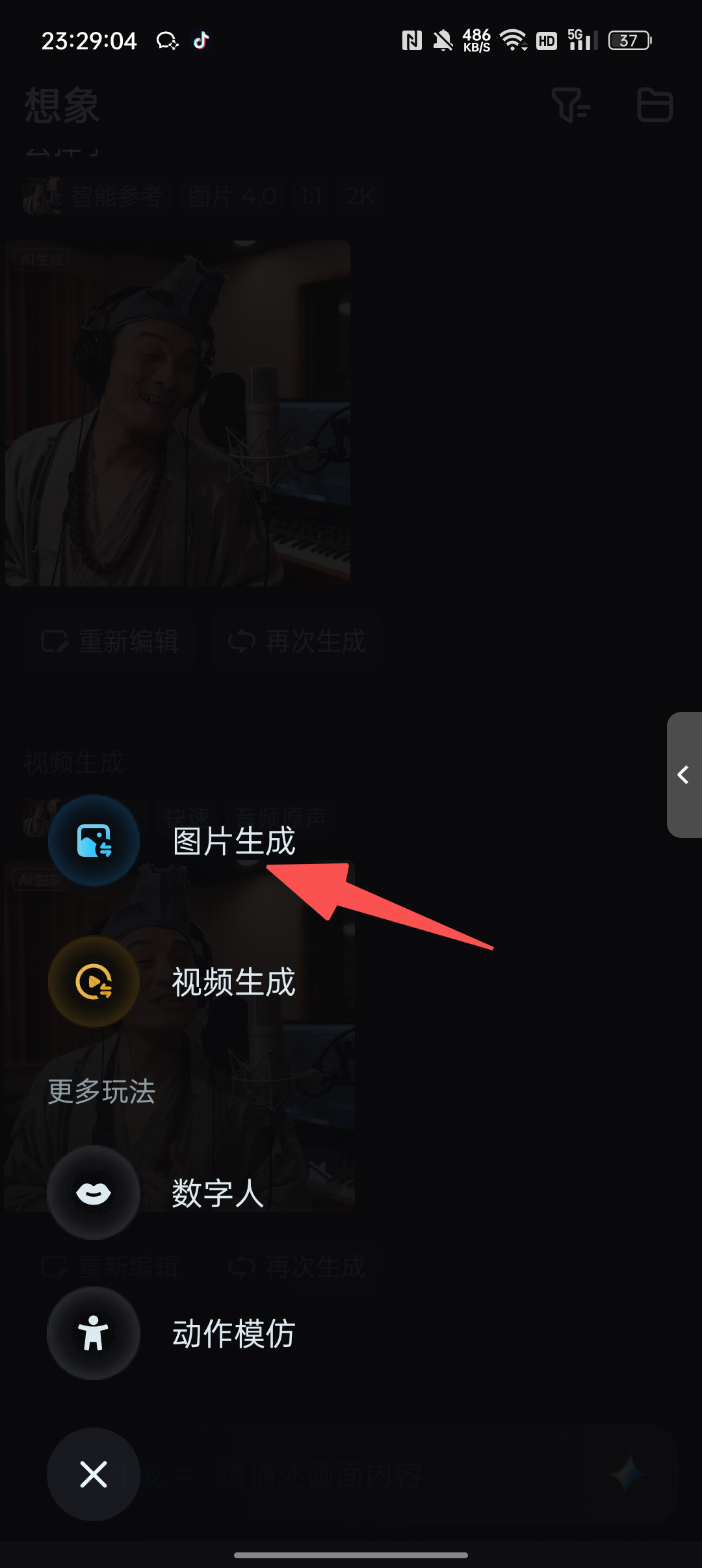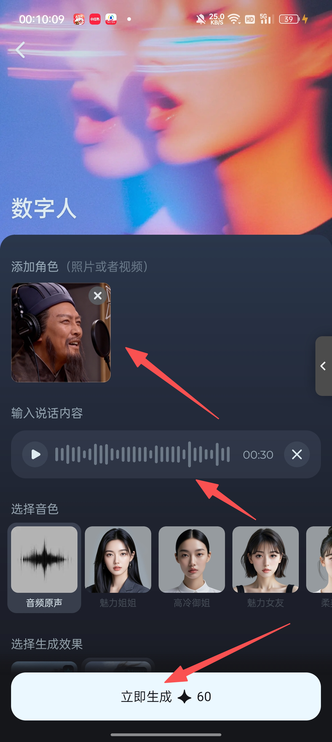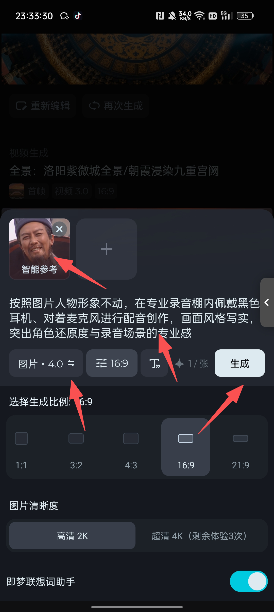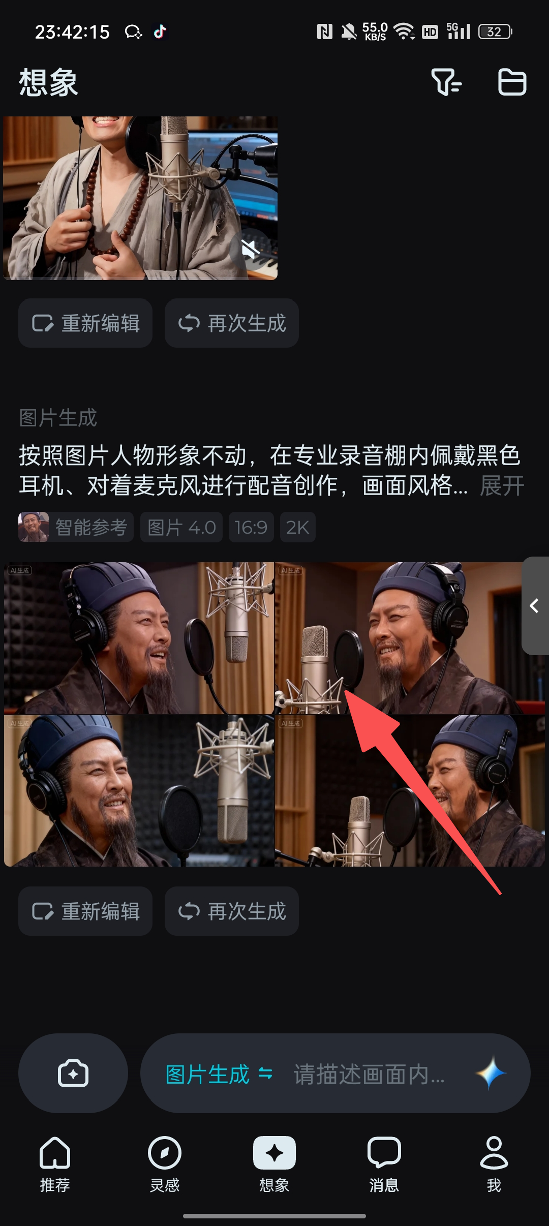 选择男生或者是女生,选择自己想要的风格,点击生成就可以了生成完成之后下载下来音乐效果:第三步:即梦对口型打开即梦,接着来生成人物的形象,先在网上找一个经典影视的照片输入口令:按照图片人物形象不动,在专业录音棚内佩戴黑色耳机、对着麦克风进行配音创作,画面风格写实,突出角色还原度与录音场景的专业感(描述词可自行修改)