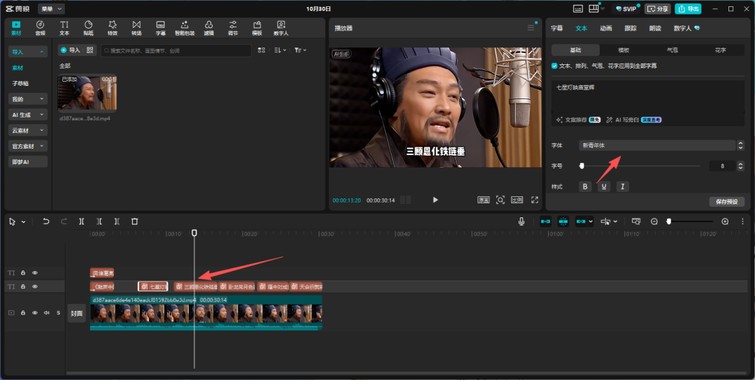 下面就可以对口型了即梦对口型,只能对30秒,可以把歌词在剪映剪辑成30秒一条,最后剪辑拼接即可