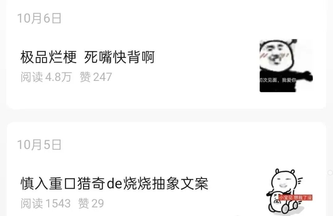 同一个号,之前阅读很一般,但当他开始用 “烂梗” 这类词做标题后,阅读量瞬间就冲上去了。