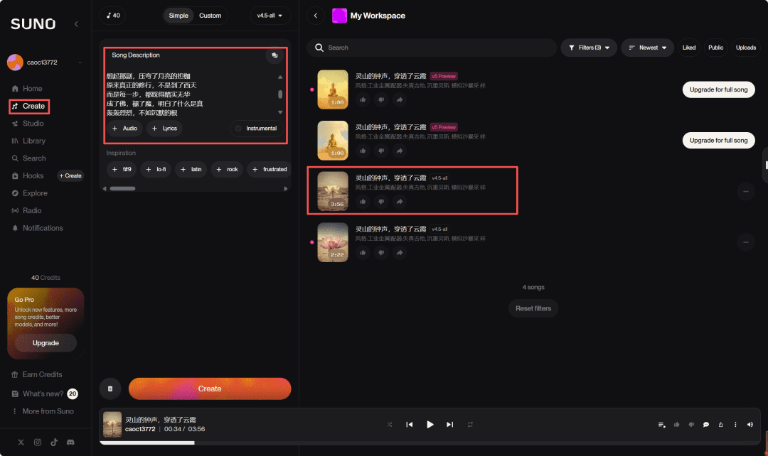 注册登录Suno→选择创造→输入歌词&风格→自定义音色