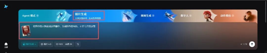 选择图片生成→上传人物原型→对话框输入提示词→图片比例16:9→点击生成
