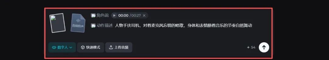 选择对口型→上传Suno生成的音频→填写动作描述→选择模式→等待生成