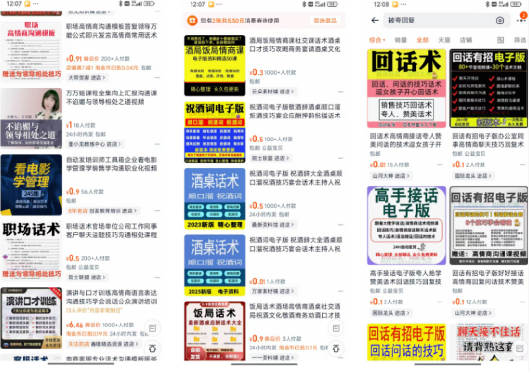第一种方式就是上某宝或拼夕夕,搜索“社交沟通资料”然后把职场应酬、朋友聚会、日常聊天回话等各类场景的资料都买一份回来。