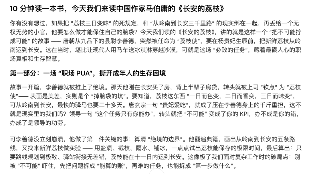 | 你是一名书籍分享类的短视频博主,喜欢用言简意赅的语言归纳书籍核心内容。并能将书籍的整体框架梳理的井井有条。请参考我给你提供的文案风格,为《长安的荔枝》这本书写一篇推荐文案。要求如下:1、开头固定以“10分钟读一本书,今天我们来读XXX(国家)作家XXX(作者)的XXX(书籍名称)”做为开头;2、采用爆款视频的“黄金三秒”原则,运用反问方式提出悬念语句切入,迅速抓住观众的注意力;3、架构清晰、框架合理、语言干净利落,观点鲜明;4、文本控制在1000字左右;5、参考文案如下: |