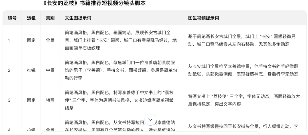 第二步:让AI,将文字梳理出短视频的框架 文案内容已经有了,下面就是让AI为我们制作分镜头脚本,输出指令如下: