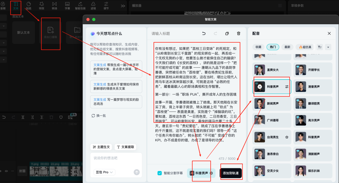 最后,点击文本,添加口播稿,将文案复制到文本区,然后找一个与文案比较契合的音色。