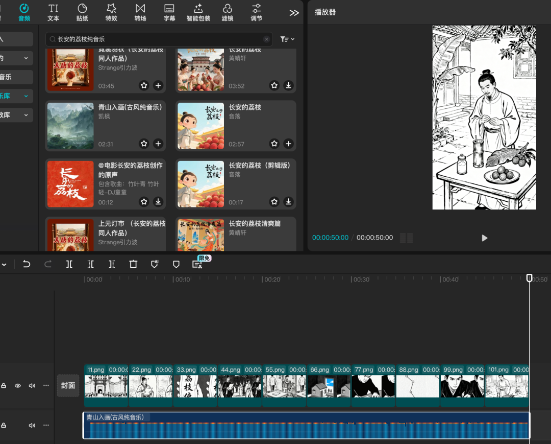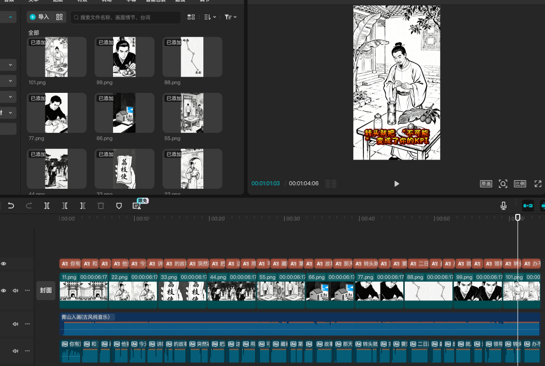 生成成功之后,大家先根据情节,看看每个图片是否符合,如果有不符合的,就让豆包重新给我们生成。 然后继续让豆包将剩下的30个分镜头生成,全部生成之后,将图片的无水印版本都下载下来。 第四步:进入剪映,输出完美的乐章 前面的都是由AI帮我们完成,只有最后一步需要我们手动完成,这一步,也没有什么技术含量,只需要我们细心点就可以了。 将前面生成的所有无水印版本的图片导入到剪映里面,然后按照顺序拖入主轨道内,然后搜索一首纯音乐作为背景音乐。