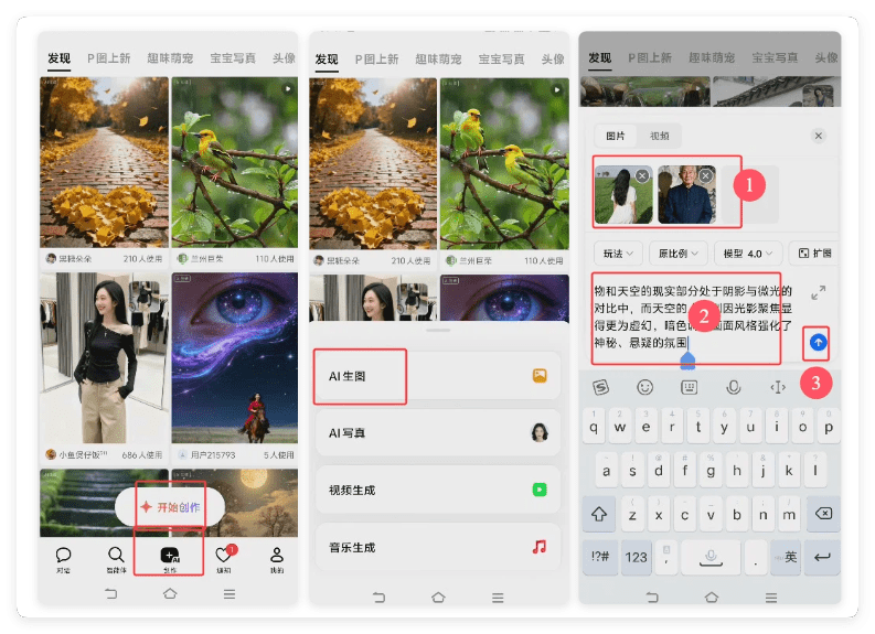 2.打开豆包APP—AI创作—开始创作—AI生图—上传照片—输入提示词